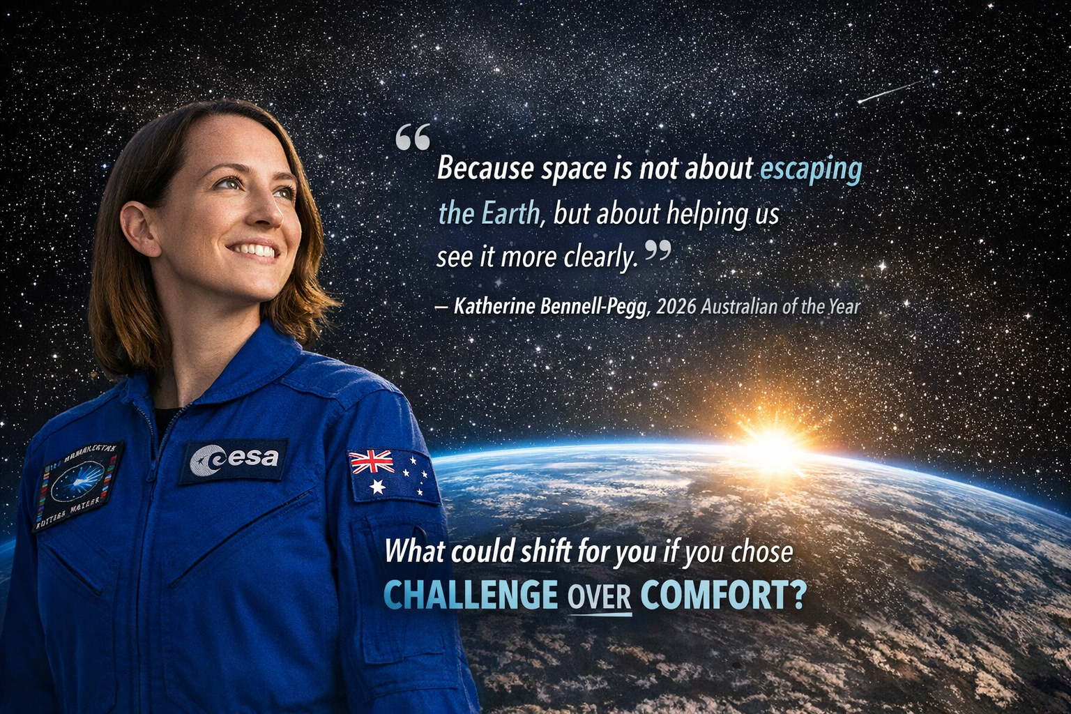 Katherine became the first person to qualify as an astronaut under the Australian flag when she graduated from the European Space Agency’s program in 2024. That means she’s now eligible to be the first Australian to participate in a space mission under our own banner. Her achievement is a landmark not just for the space community, but for anyone who has ever imagined doing something that’s never been done before.